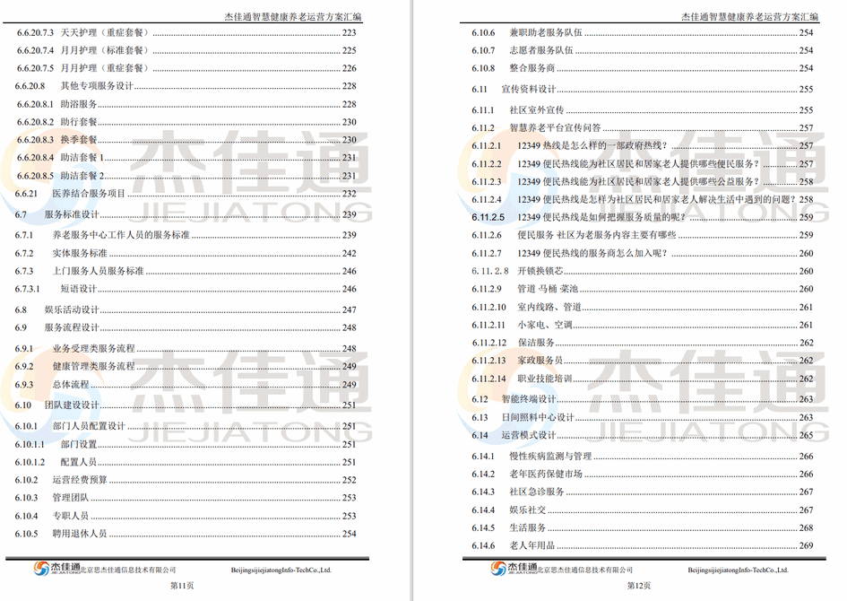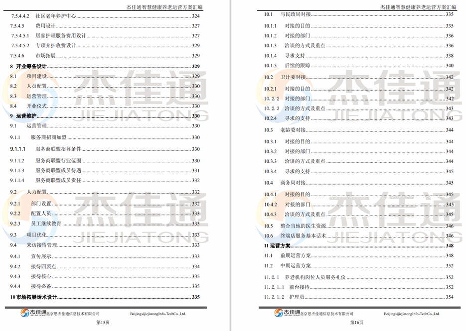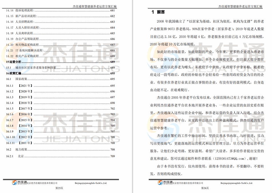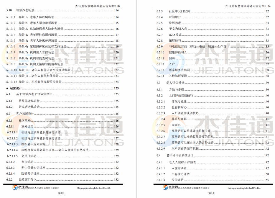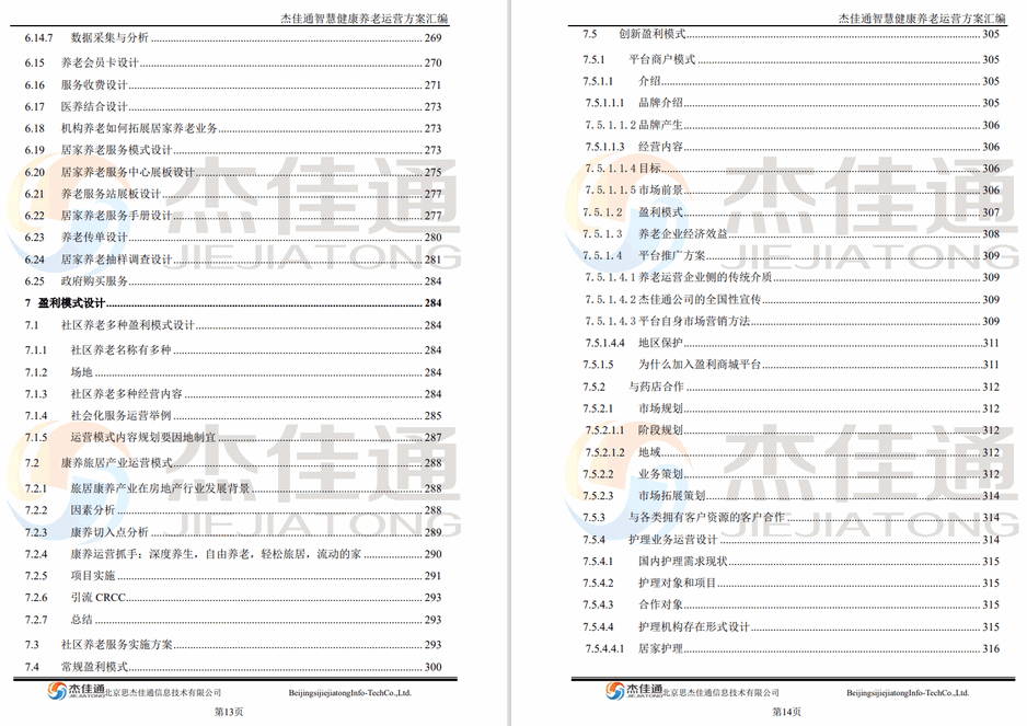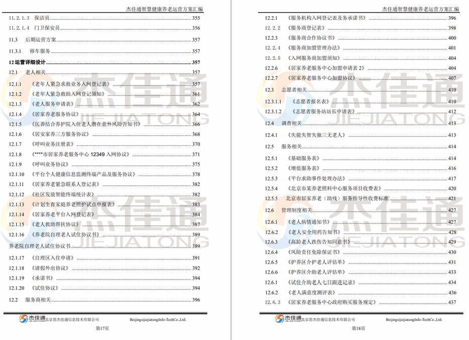 本養(yǎng)老運營方案凝聚了杰佳通工程師們16年的心血,總結出了居家養(yǎng)老、機構養(yǎng)老、社區(qū)養(yǎng)老運營過程中團隊組建、運營設計、方案設計、活動設計、老人心里分析、各種環(huán)境下的養(yǎng)老運營盈利模式等等,方案每月都在更新,目前已經(jīng)更新到近千頁,方案精細,細致到在社區(qū)如何組織老人活動,如何書寫宣傳語,如何和老人簽訂協(xié)議,即使你是“0”基礎入門養(yǎng)老,也可以讓您快速上手,快速盈利;既避免了您少走彎路,又避免了在簡單事情上浪費時間,充分把杰佳通智慧養(yǎng)老平臺的精髓融入到養(yǎng)老運營中。